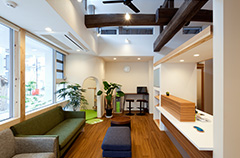 一般的に病院や歯科医院の待合室は、暗く冷たいイメージですが、できるだけゆったりとくつろいで頂けるよう、ガラス面を多くした開放的な雰囲気の空間となっております。