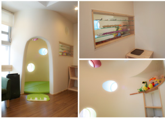 当院のキッズルームは、ぬいぐるみ・子供向けDVD・ショーケースに電車や飛行機が飾られています。 ショーケース越しにお子様の様子をこっそり見ることもできます。